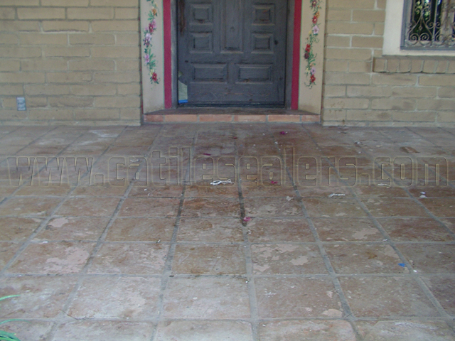 - Mexican Saltillo paver tile with peeling sealer, water damage and heavy sealer build-up.